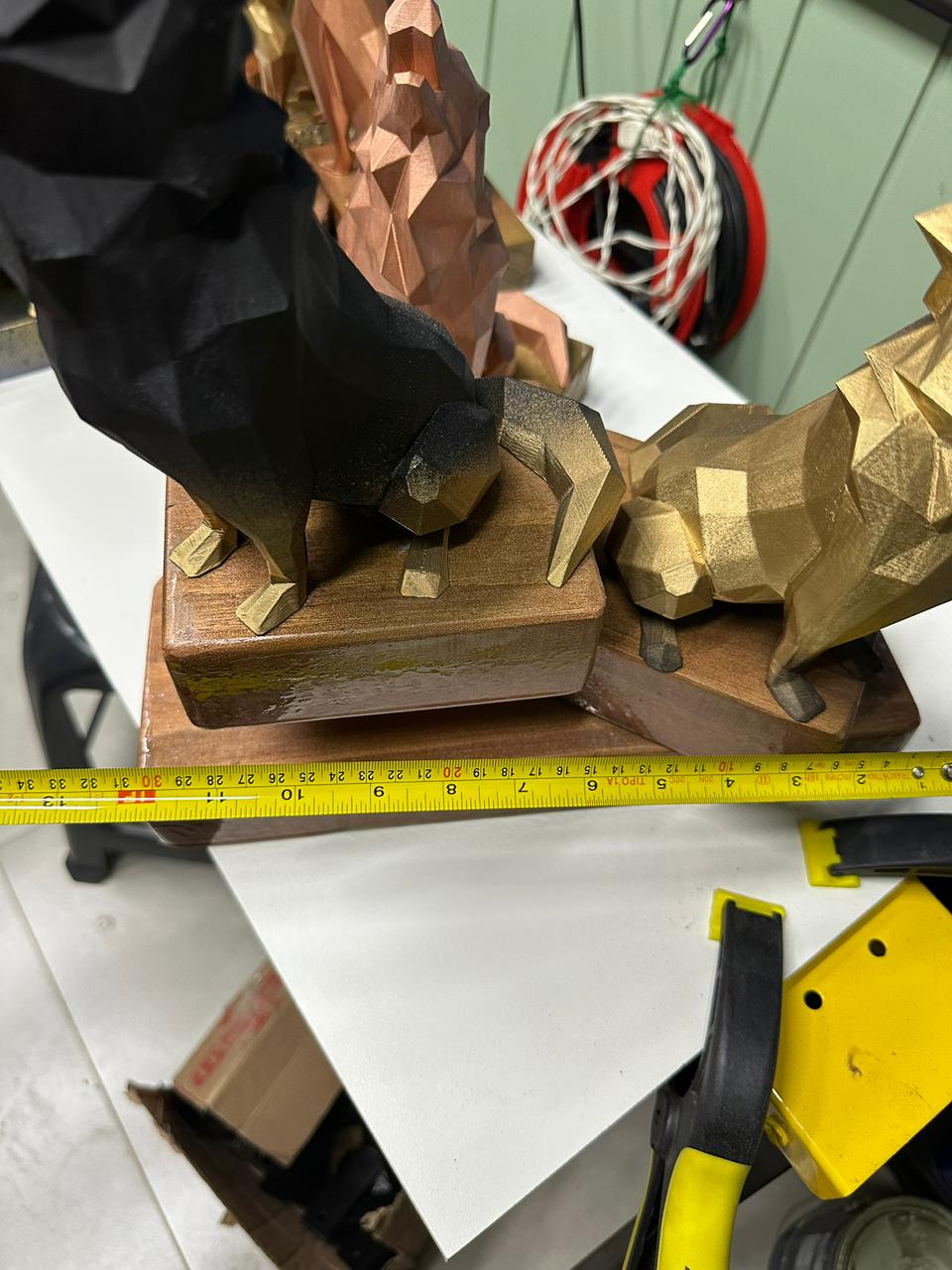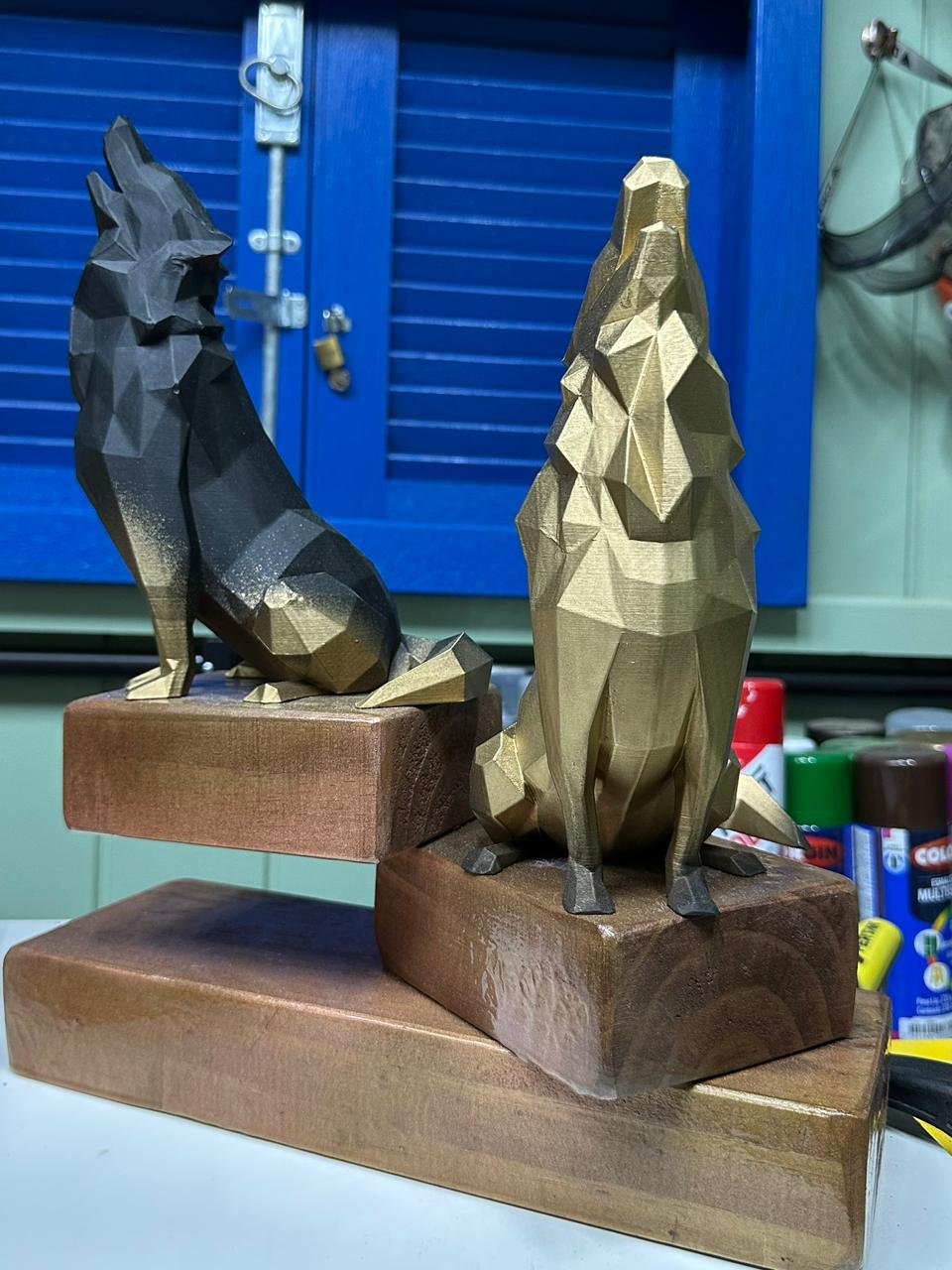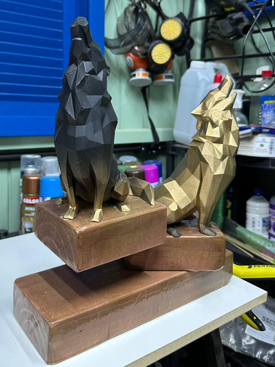 O Primeiro Lobo: Acabamento em Ouro Metalizado com detalhes profundos em preto, exaltando o brilho e a nobreza.