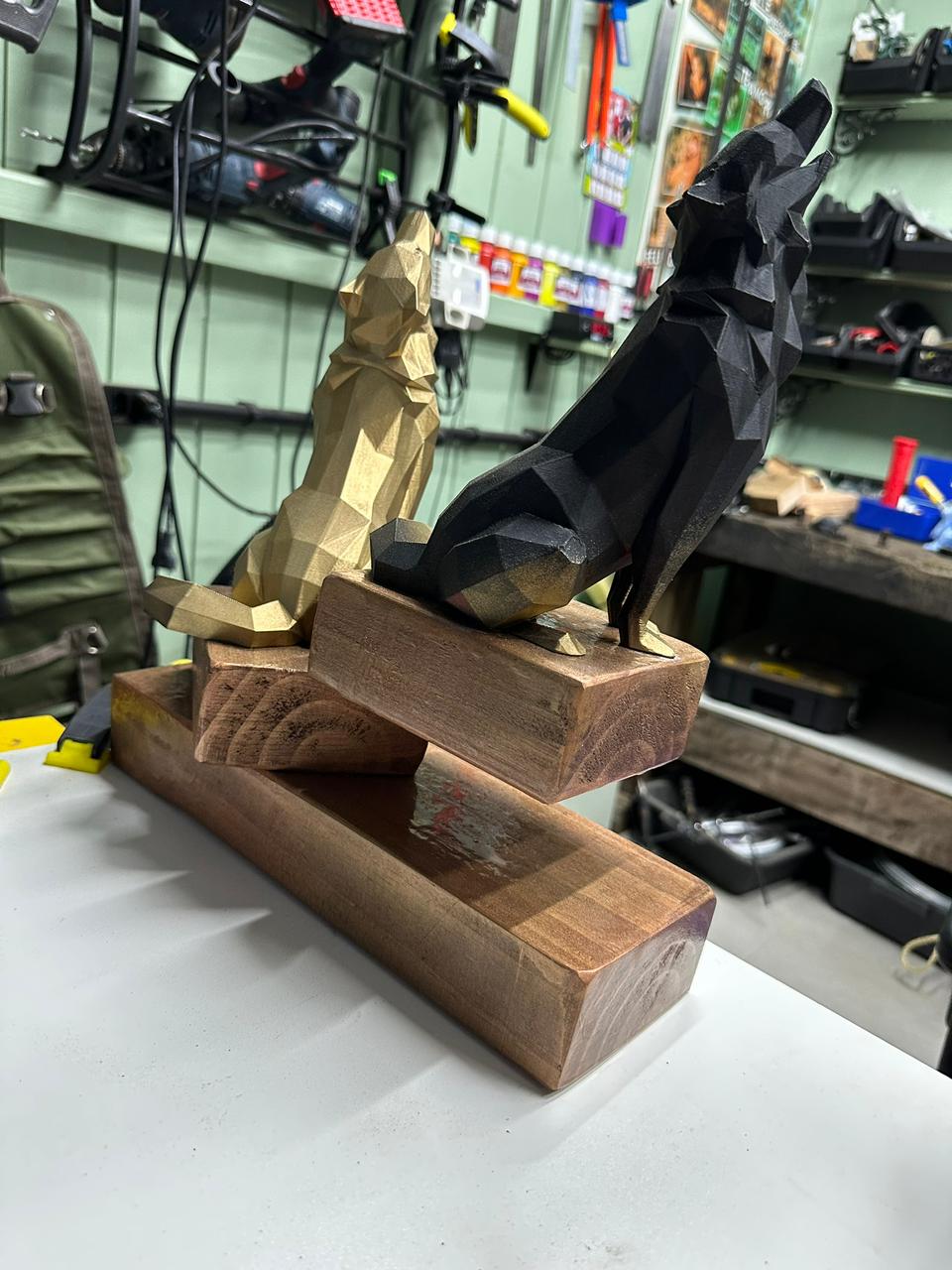 Com impressionantes 38 cm de altura e 30 cm de largura, a peça apresenta a fascinante dualidade de um casal de lobos em um jogo de cores invertidas: