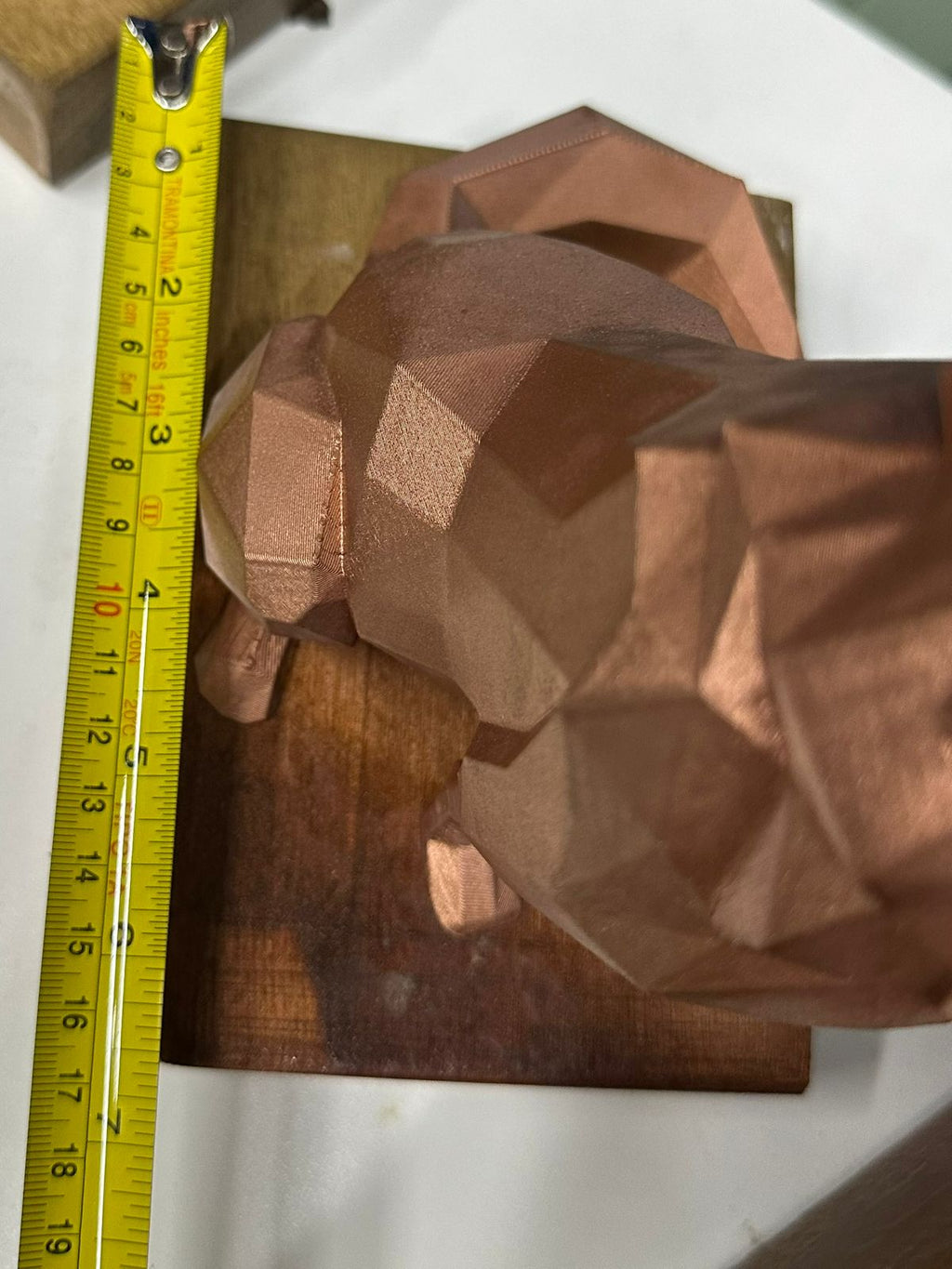 O lobo apresenta um acabamento impecável em bronze metalizado, conferindo à peça uma aparência de fundição clássica com reflexos profundos. O grande destaque desta edição é a sua base em tronco fatiado, que preserva as linhas orgânicas da madeira. A base é estilizada no tom mogno e recebe uma finalização luxuosa em resina epóxi pincelada manualmente, resultando em um brilho vitrificado que protege e realça os veios naturais do design.