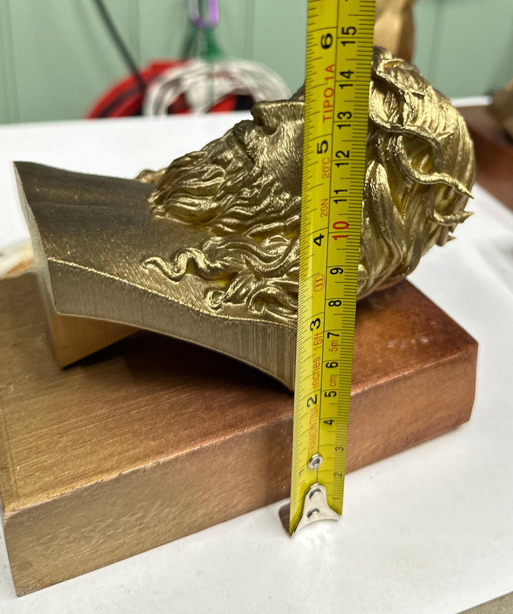 Acabamento: Pintura artística multicromática (Ouro e Bronze) com blindagem em resina epóxi de alto brilho.