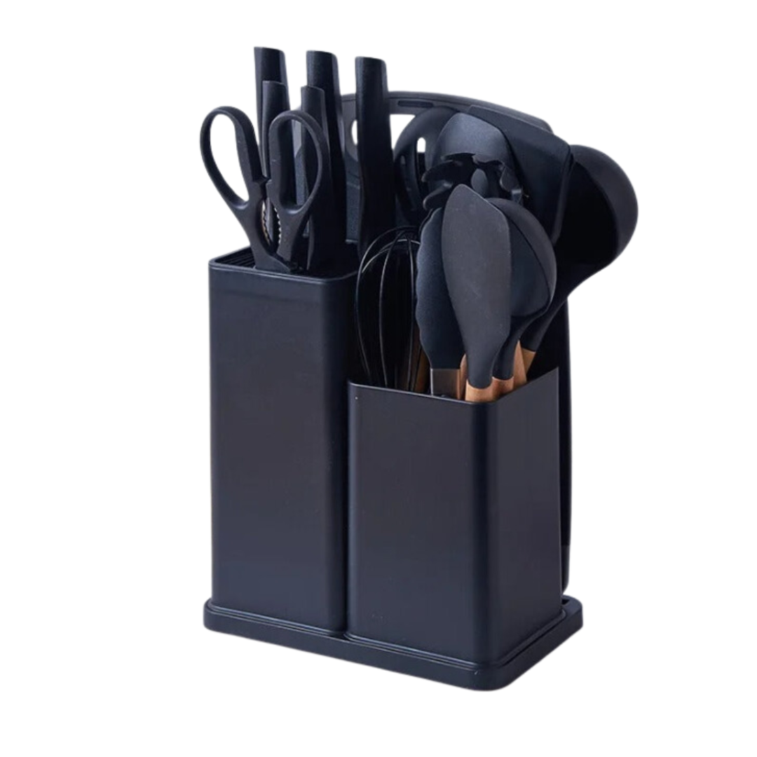 Imagina ter todos os utensílios que sempre quis, organizados e prontos para o uso? Com 19 peças em silicone de alta qualidade, você tem espátulas, facas, tábua e muito mais. Tudo resistente ao calor e com design ergonômico, ideal para quem gosta de praticidade e estilo na cozinha. 🧑🍳